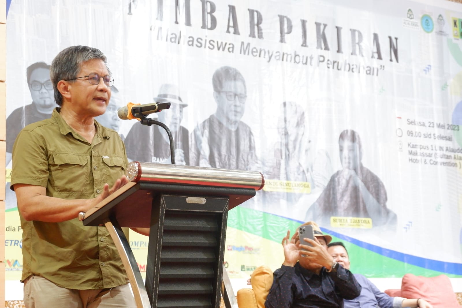 SIMPULINDONESIA.COM_ MAKASSAR,- Rocky Gerung hadir sebagai Narasumber di Seminar Mimbar Pikiran yang digelar di Kampus 1 Universitas Islam Negeri Alauddin Makassar. Seminar yang bertemakan "Mahasiswa Menyambut Perubahan" itu di Gelar oleh Himpunan Mahasiswa Program Studi Ilmu Politik berkolaborasi bersama Senat Mahasiswa Fakultas Ushuluddin dan Filsafat.selasa, (23/05/2023)